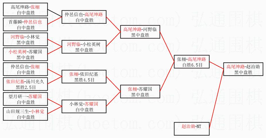 1.高尾绅路获得冠军,赵治勋获得亚军。决赛比分:高尾绅路3:0赵治勋。棋局: