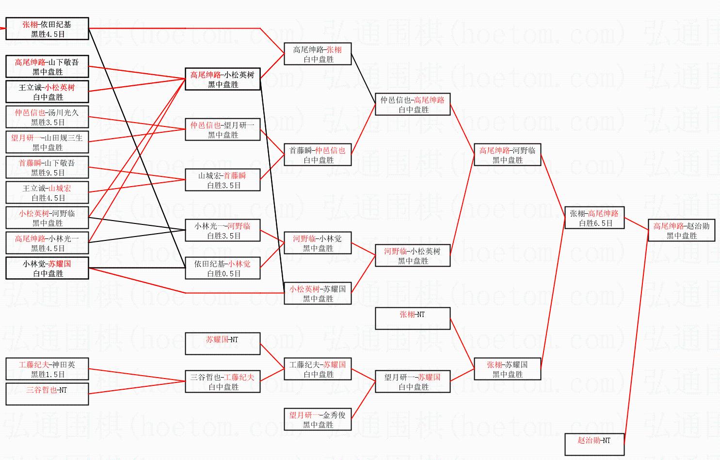 1.高尾绅路获得冠军,赵治勋获得亚军。决赛比分:高尾绅路3:0赵治勋。棋局: