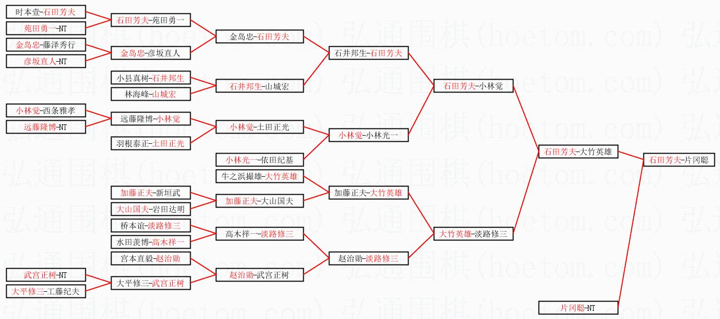 1.石田芳夫获得冠军,片冈聪获得亚军。决赛比分:石田芳夫3:1片冈聪。棋局: