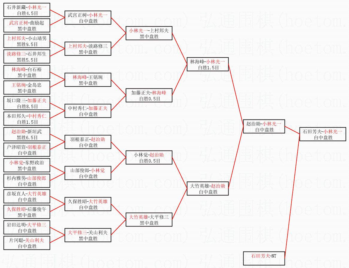 1.小林光一获得冠军,石田芳夫获得亚军。决赛比分:小林光一3:0石田芳夫。棋局: