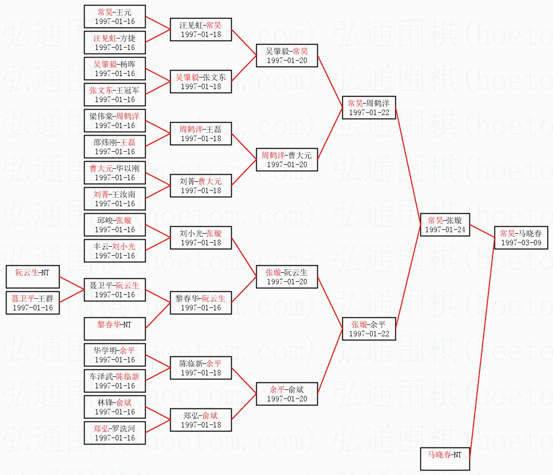 1.常昊获得冠军,马晓春获得亚军。决赛比分:常昊3:1马晓春。棋局: