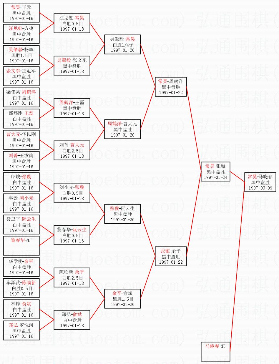 1.常昊获得冠军,马晓春获得亚军。决赛比分:常昊3:1马晓春。棋局:
