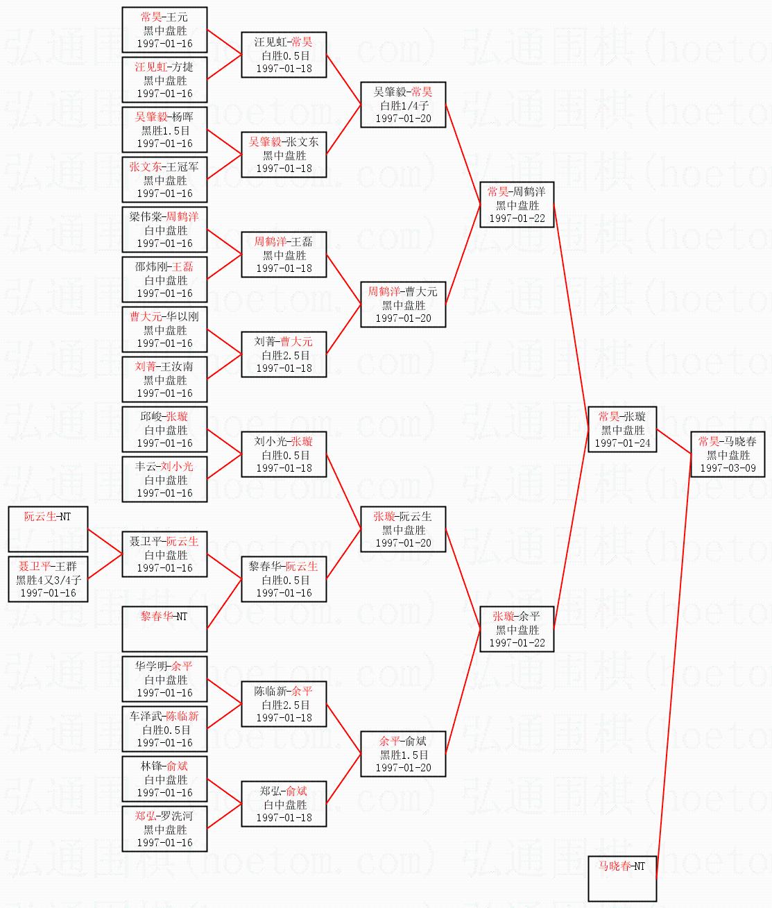 1.常昊获得冠军,马晓春获得亚军。决赛比分:常昊3:1马晓春。棋局: