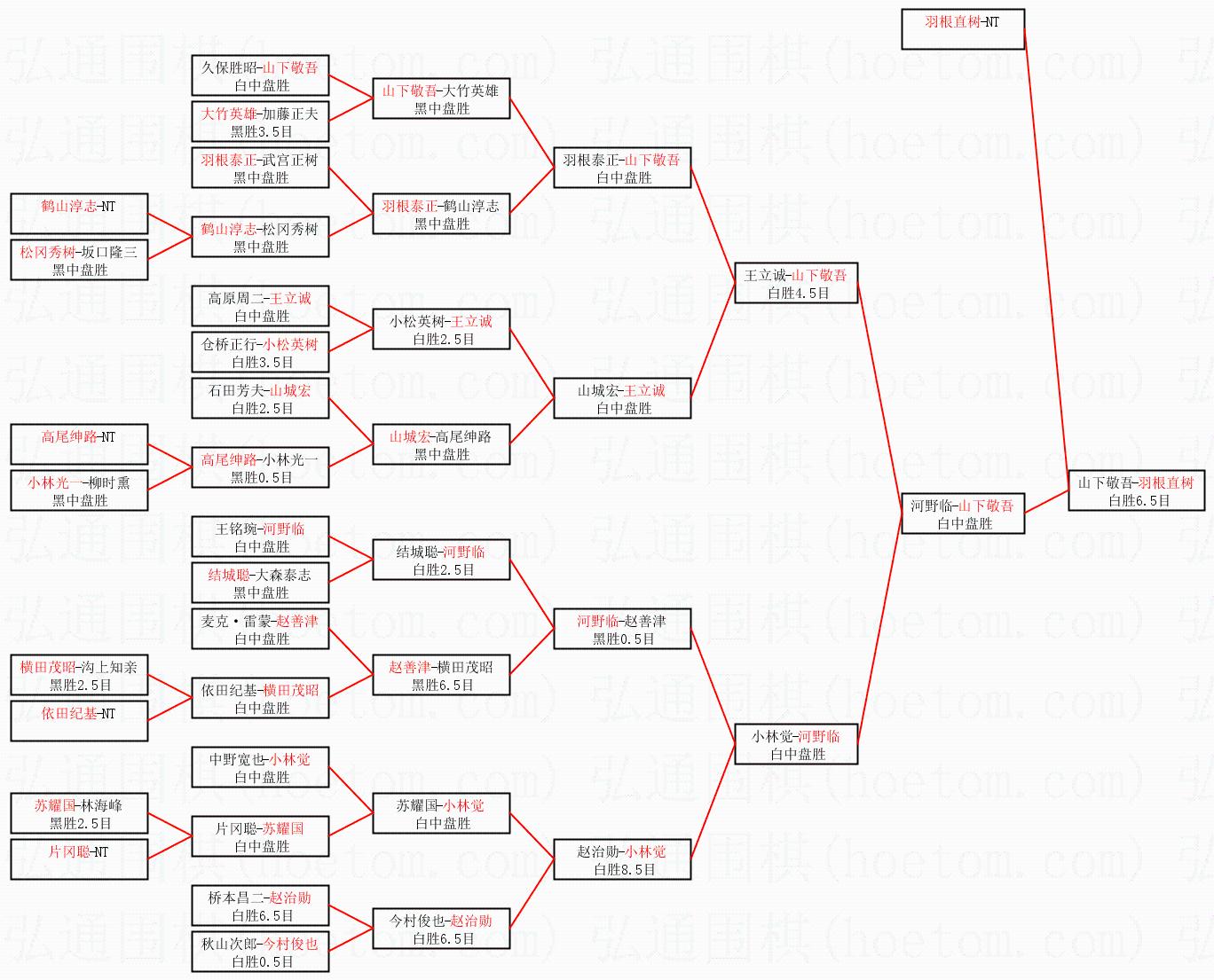 1.羽根直树获得冠军,山下敬吾获得亚军。决赛比分:羽根直树3:2山下敬吾。棋局: