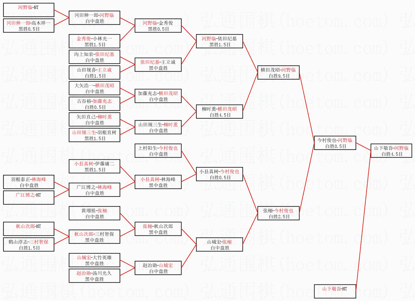 1.河野临获得冠军,山下敬吾获得亚军。决赛比分:河野临3:2山下敬吾。棋局: