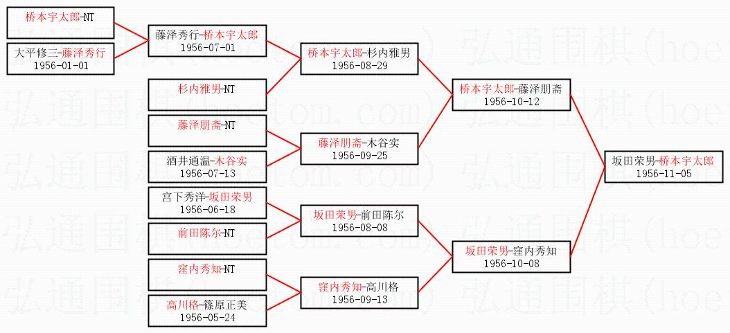 1.桥本宇太郎获得冠军,坂田荣男获得亚军。决赛比分:桥本宇太郎2:0坂田荣男。棋局: