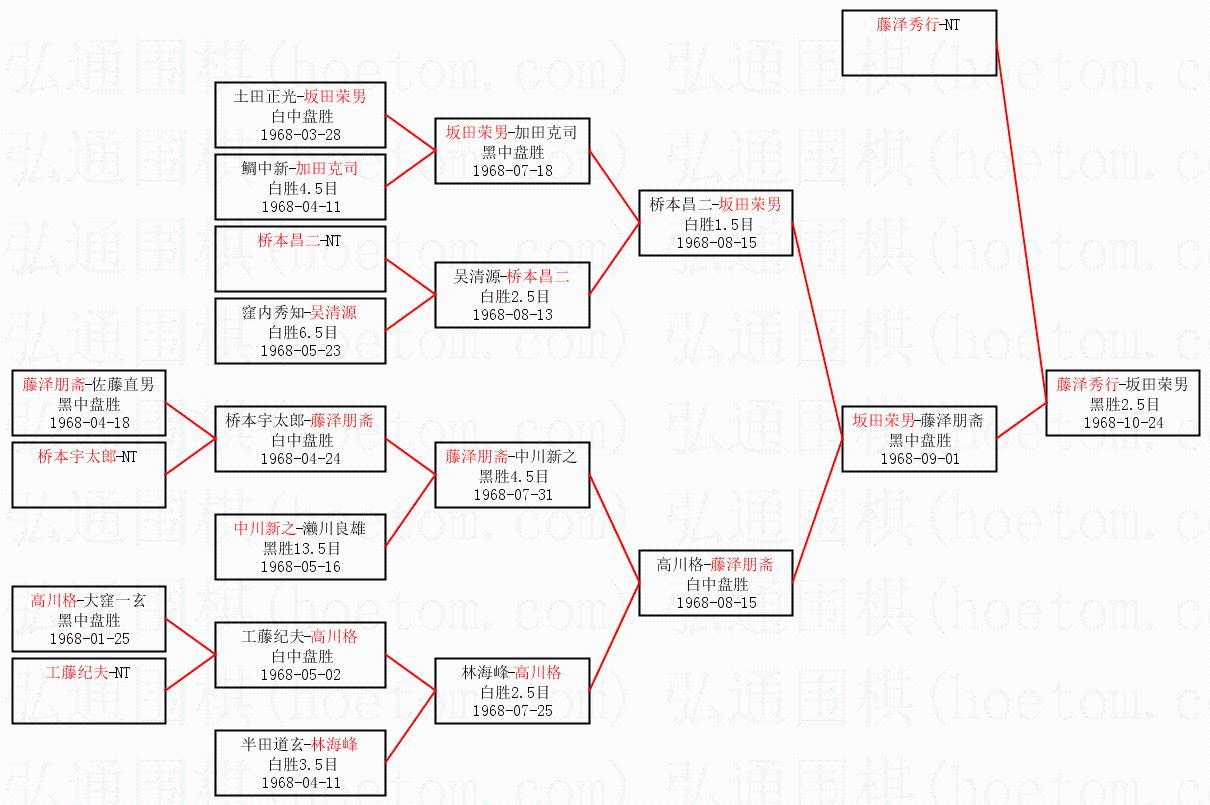 1.藤泽秀行获得冠军,坂田荣男获得亚军。决赛比分:藤泽秀行2:0坂田荣男。棋局: