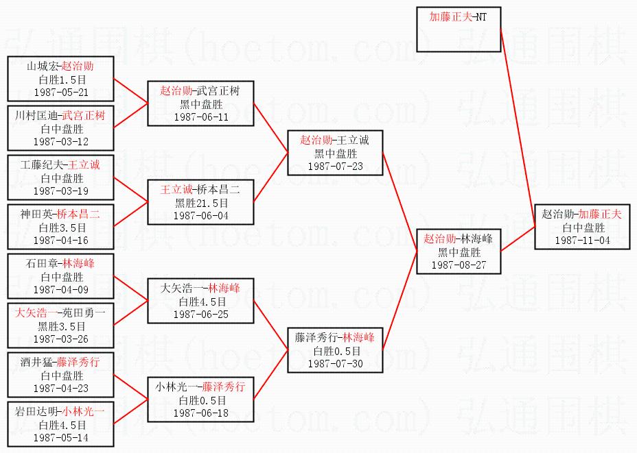 1.加藤正夫获得冠军,赵治勋获得亚军。决赛比分:加藤正夫3:1赵治勋。棋局: