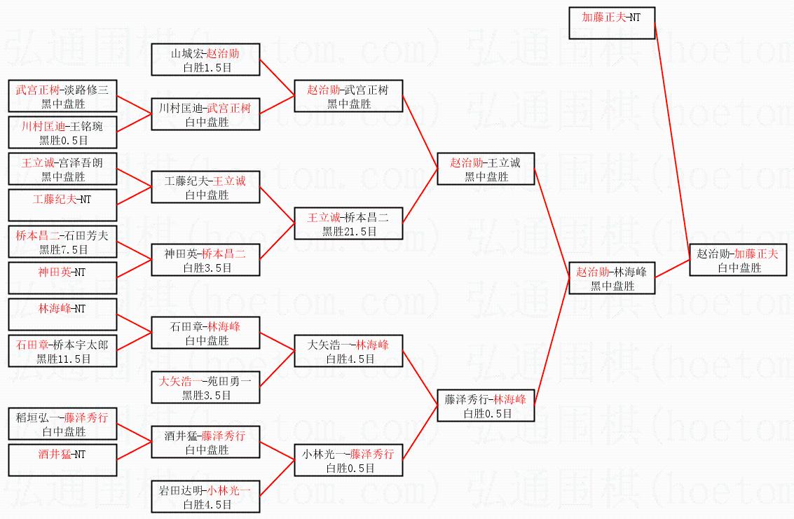 1.加藤正夫获得冠军,赵治勋获得亚军。决赛比分:加藤正夫3:1赵治勋。棋局:
