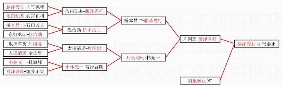 1.藤泽秀行获得冠军,羽根泰正获得亚军。决赛比分:藤泽秀行2:1羽根泰正。棋局: