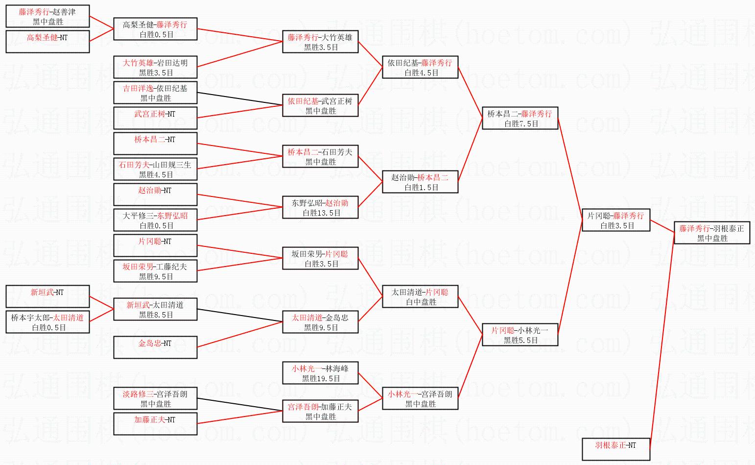 1.藤泽秀行获得冠军,羽根泰正获得亚军。决赛比分:藤泽秀行2:1羽根泰正。棋局:
