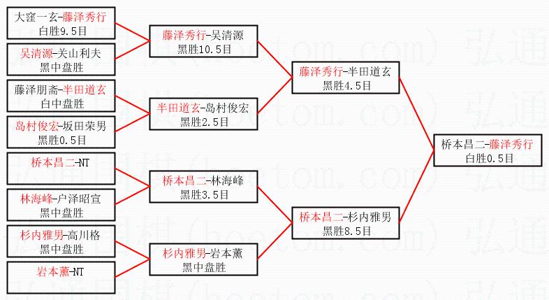 1.藤泽秀行获得冠军,桥本昌二获得亚军。决赛比分:藤泽秀行2:0桥本昌二。棋局: