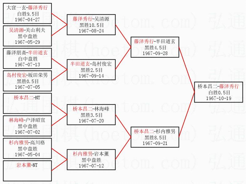 1.藤泽秀行获得冠军,桥本昌二获得亚军。决赛比分:藤泽秀行2:0桥本昌二。棋局: