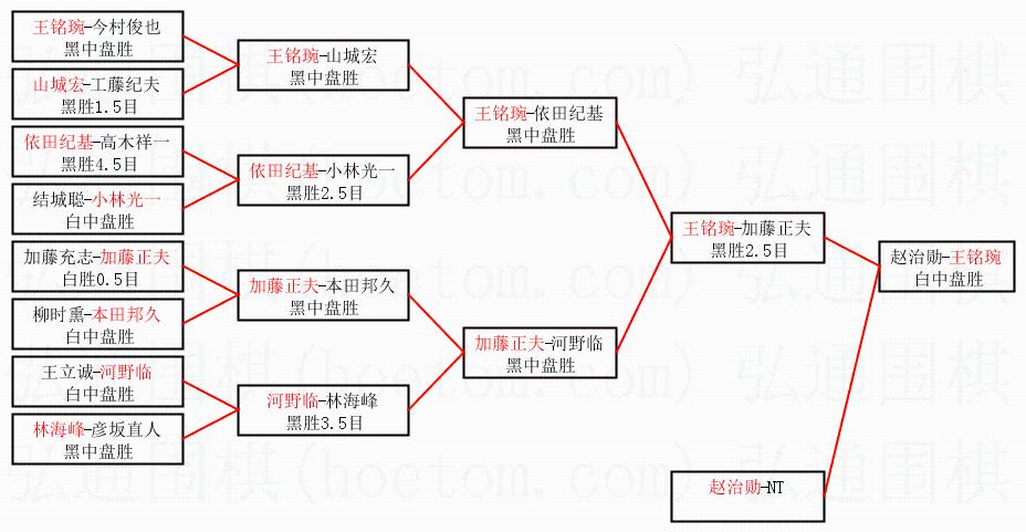 1.王铭琬获得冠军,赵治勋获得亚军。决赛比分:王铭琬3:2赵治勋。棋局: