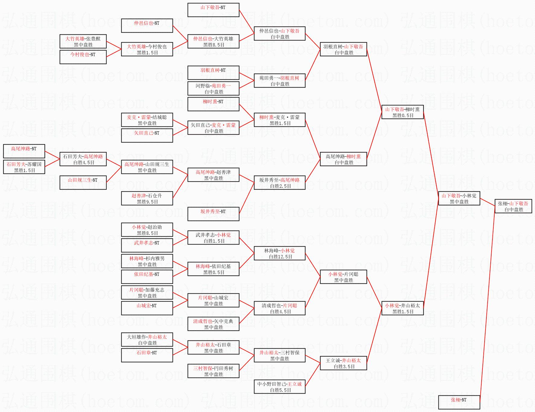 1.山下敬吾获得冠军,张栩获得亚军。决赛比分:山下敬吾3:1张栩。棋局: