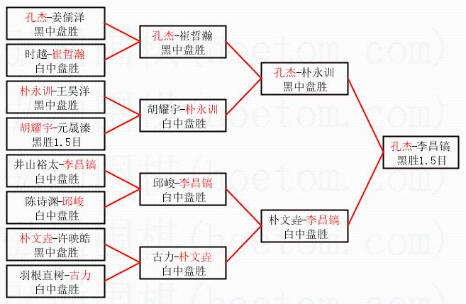1.孔杰获得冠军,李昌镐获得亚军。决赛比分:孔杰2:0李昌镐。棋局: