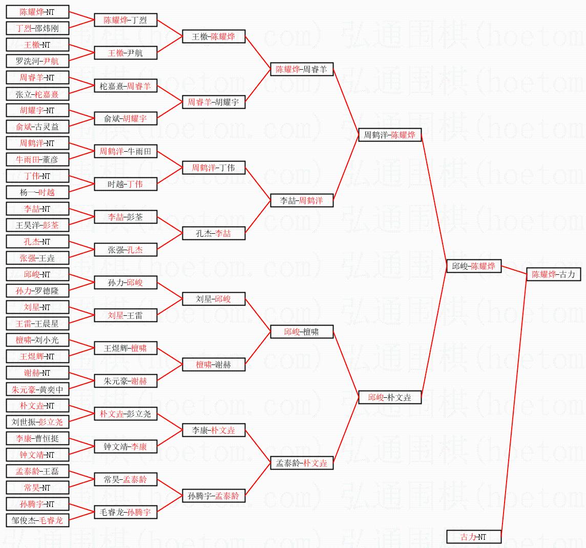 1.陈耀烨获得冠军,古力获得亚军。决赛比分:陈耀烨2:0古力。棋局: