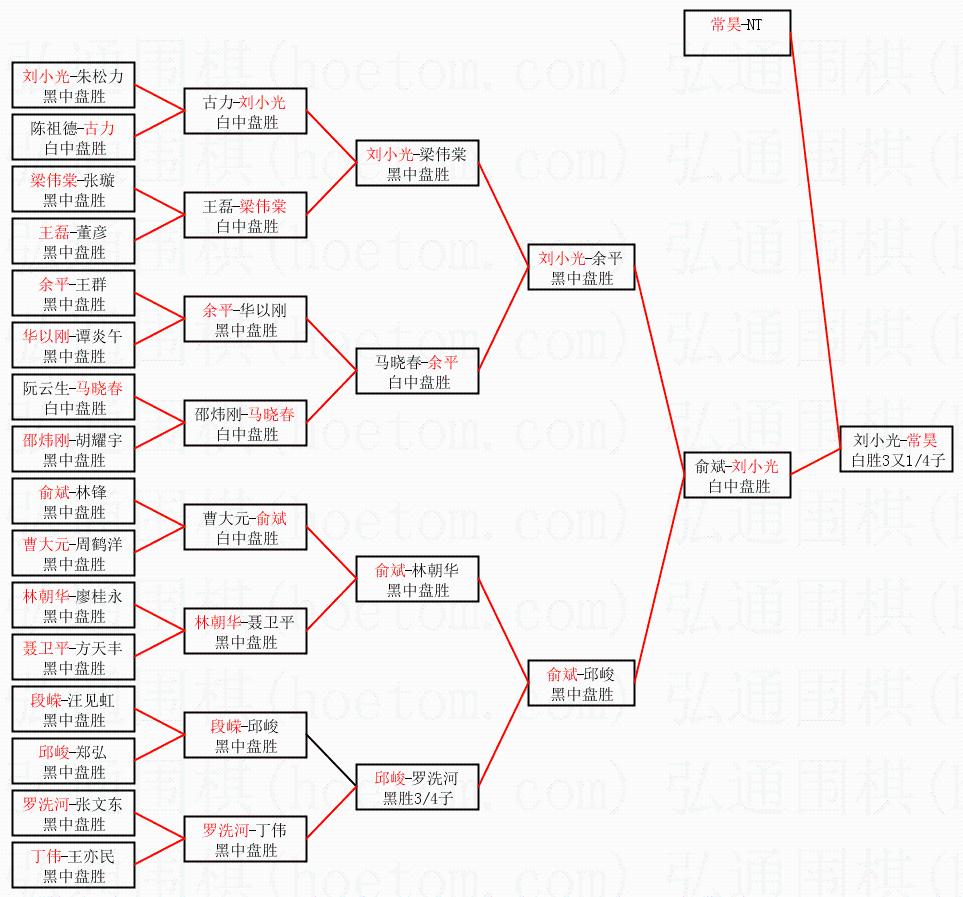 1.常昊获得冠军,刘小光获得亚军。决赛比分:常昊3:1刘小光。棋局: