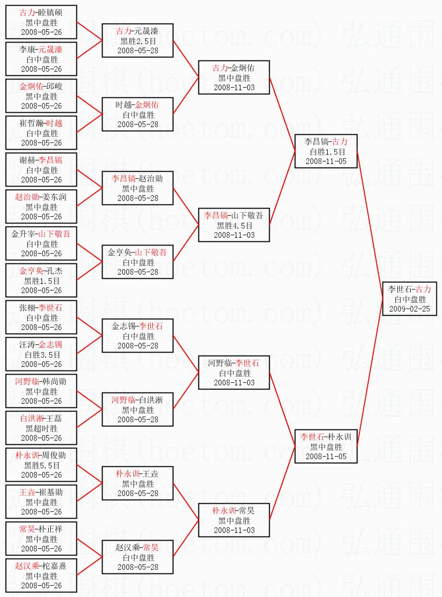 1.古力获得冠军,李世石获得亚军。决赛比分:古力2:0李世石。棋局:
