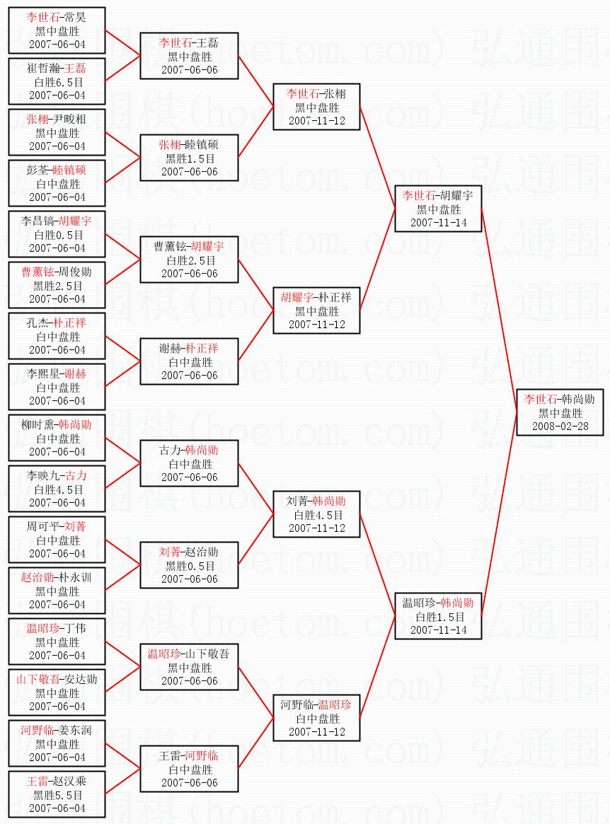 | 1.李世石获得冠军,韩尚勋获得亚军。决赛比分:李世石2:1韩尚勋。棋局: | ||