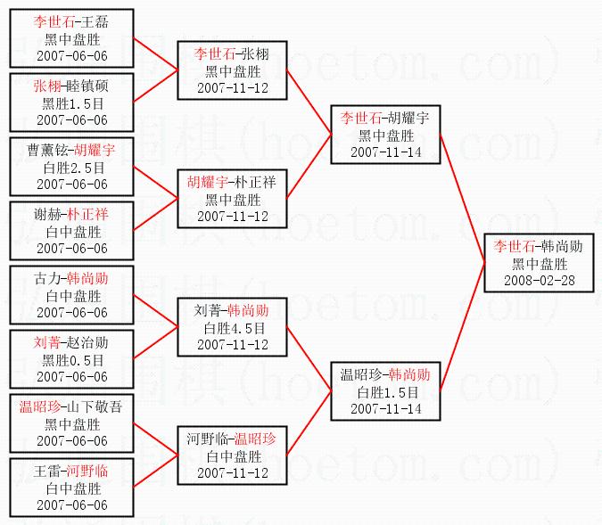 | 1.李世石获得冠军,韩尚勋获得亚军。决赛比分:李世石2:1韩尚勋。棋局: | ||