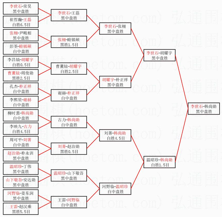 | 1.李世石获得冠军,韩尚勋获得亚军。决赛比分:李世石2:1韩尚勋。棋局: | ||