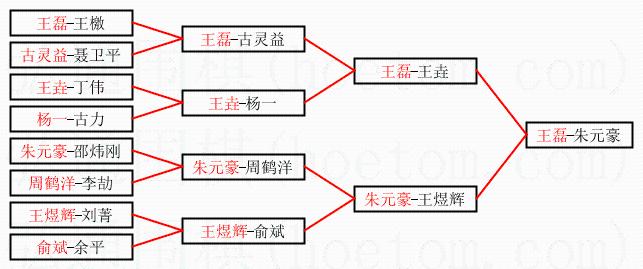 1.王磊获得冠军,朱元豪获得亚军。决赛比分:王磊1:0朱元豪。棋局: