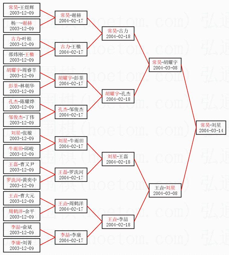 1.常昊获得冠军,刘星获得亚军。决赛比分:常昊1:0刘星。棋局: