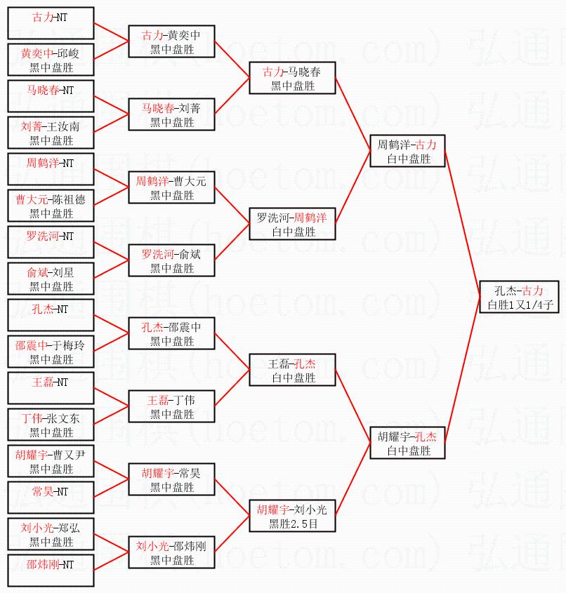 1.古力获得冠军,孔杰获得亚军。决赛比分:古力1:0孔杰。棋局: