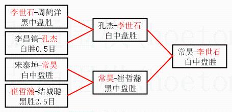 1.李世石获得冠军,常昊获得亚军。决赛比分:李世石2:1常昊。棋局: