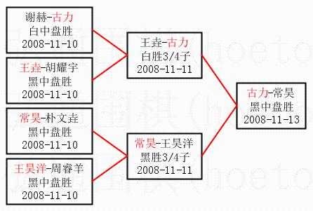 1.古力获得冠军,常昊获得亚军。决赛比分:古力1:0常昊。棋局: