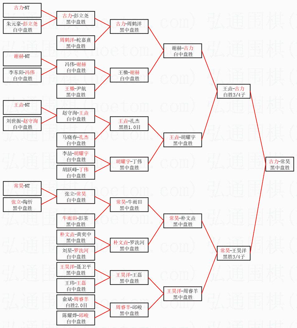 1.古力获得冠军,常昊获得亚军。决赛比分:古力1:0常昊。棋局: