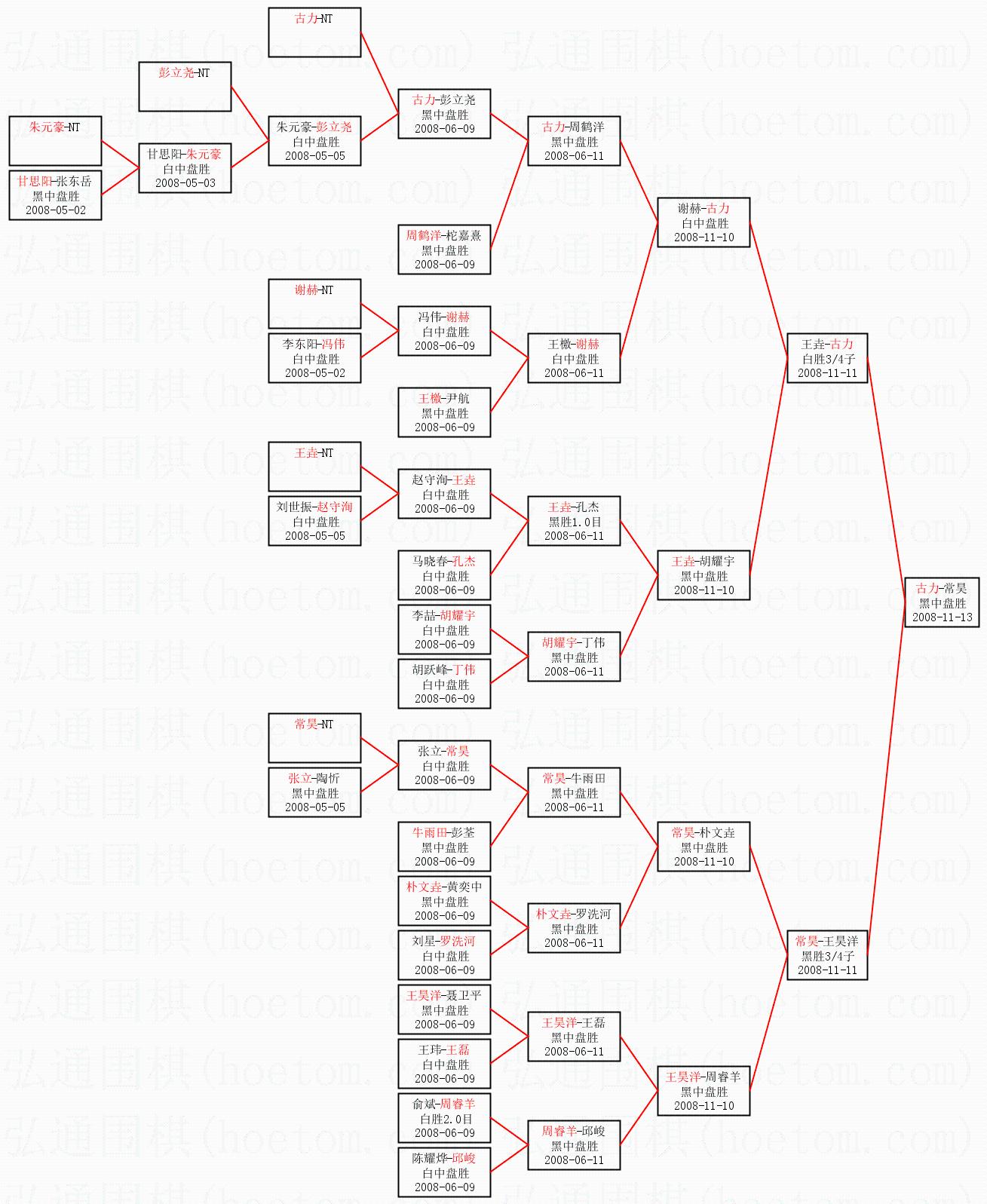 1.古力获得冠军,常昊获得亚军。决赛比分:古力1:0常昊。棋局: