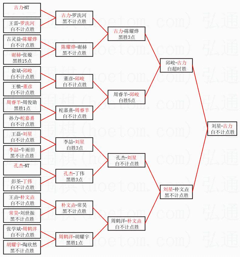 1.古力获得冠军,刘星获得亚军。决赛比分:古力2:1刘星。棋局: