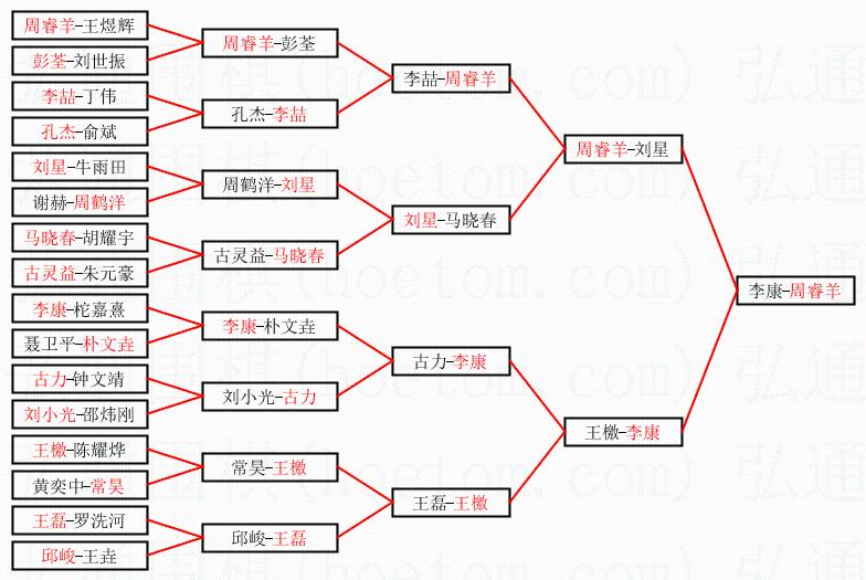 1.周睿羊获得冠军,李康获得亚军。决赛比分:周睿羊1:0李康。棋局: