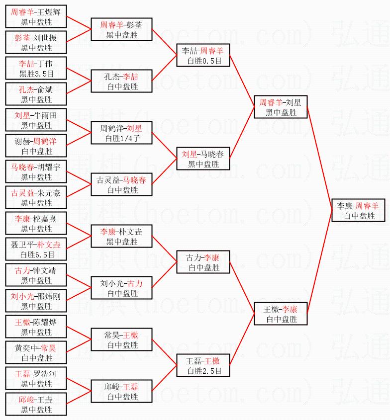 1.周睿羊获得冠军,李康获得亚军。决赛比分:周睿羊1:0李康。棋局: