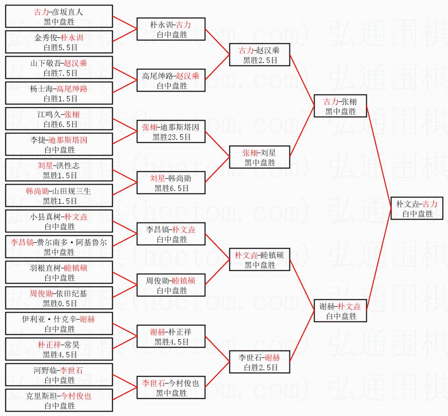 1.古力获得冠军,朴文垚获得亚军。决赛比分:古力2:0朴文垚。棋局: