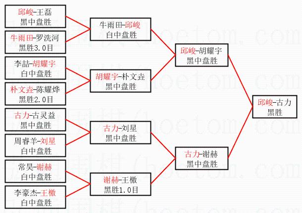 1.邱峻获得冠军,古力获得亚军。决赛比分:邱峻1:0古力。棋局: