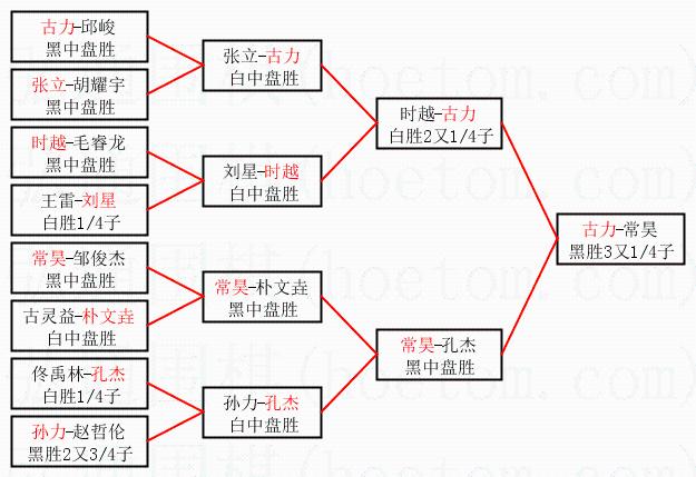 1.古力获得冠军,常昊获得亚军。决赛比分:古力1:0常昊。棋局: