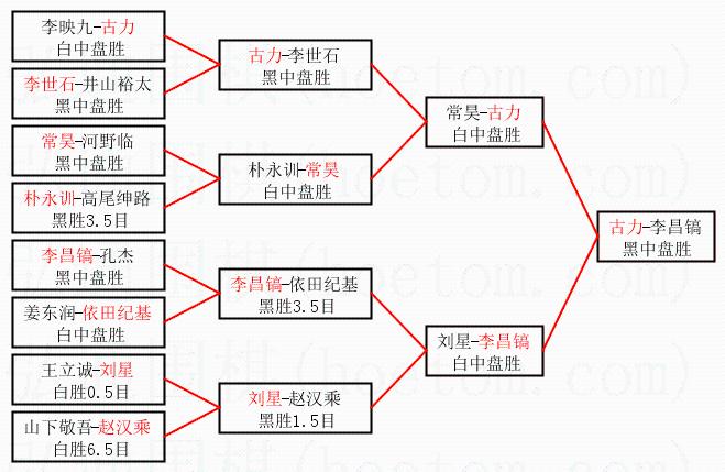 | 1.古力获得冠军,李昌镐获得亚军。决赛比分:古力1:0李昌镐。棋局: | ||
