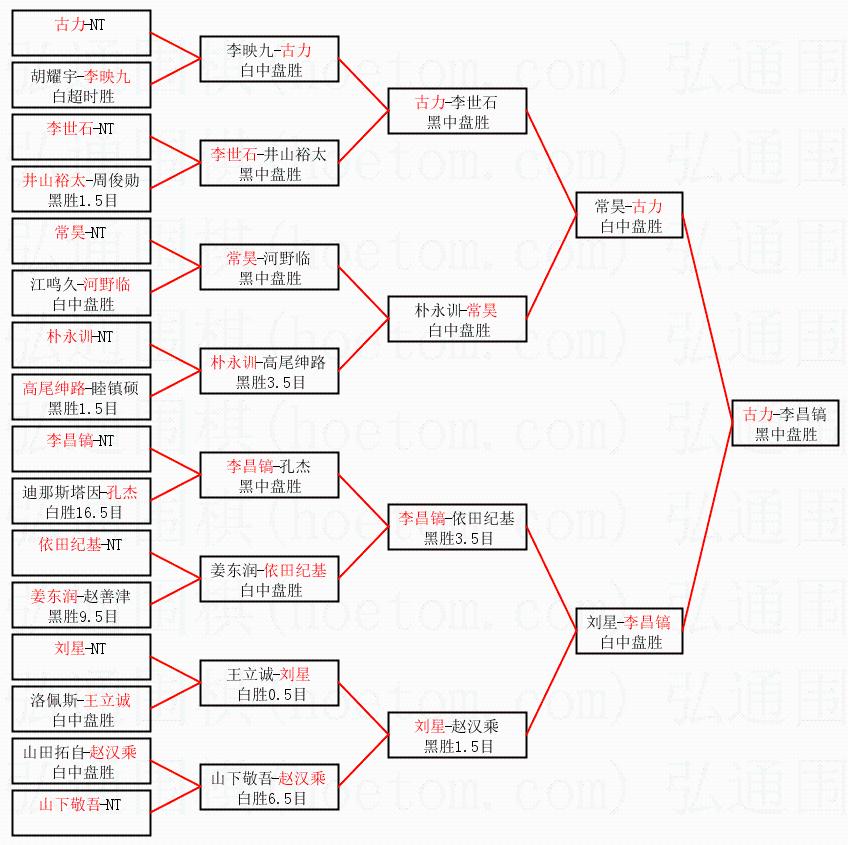 1.古力获得冠军,李昌镐获得亚军。决赛比分:古力1:0李昌镐。棋局: