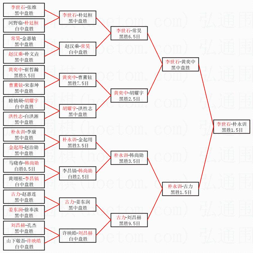 2.上半区半决赛李世石获胜, 比分:李世石 2:0 黄奕中。棋局: