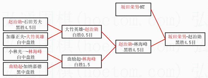 | 1.坂田荣男获得冠军,赵治勋获得亚军。决赛比分:坂田荣男3:2赵治勋。棋局: | ||
