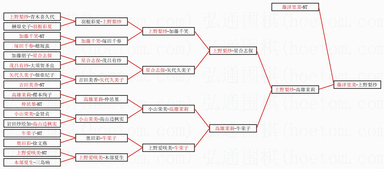 1.藤泽里菜获得冠军,上野梨纱获得亚军。决赛比分:藤泽里菜3:2上野梨纱。棋局: