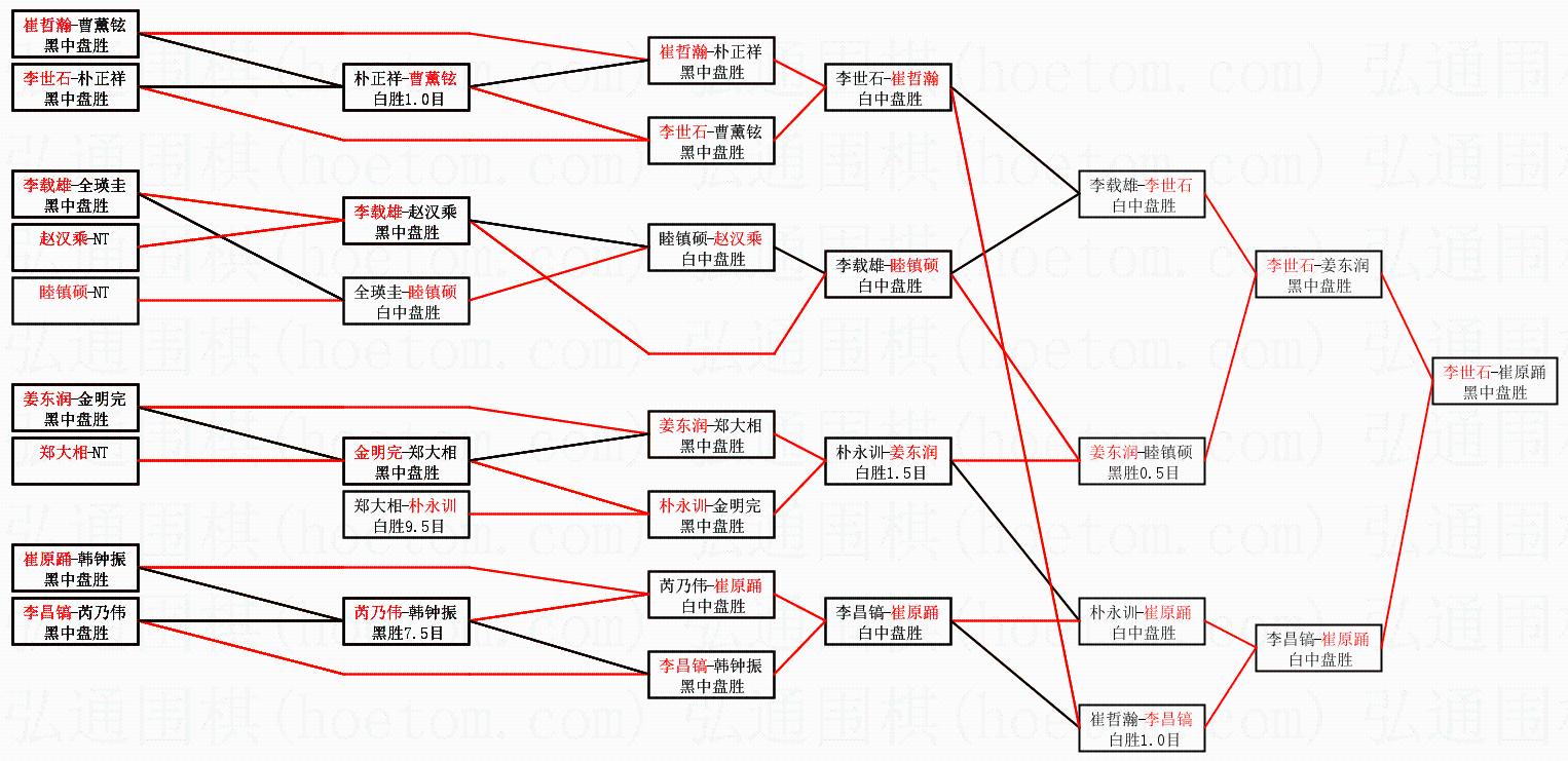 1.李世石获得冠军,崔原踊获得亚军。决赛比分:李世石2:0崔原踊。棋局: