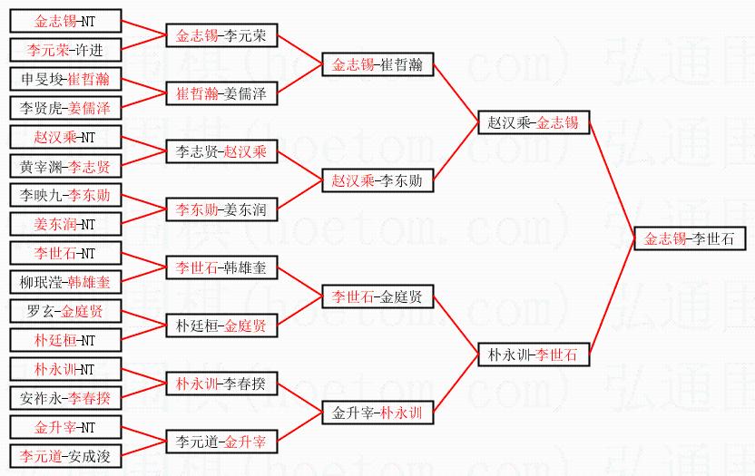 1.金志锡获得冠军,李世石获得亚军。决赛比分:金志锡3:0李世石。棋局: