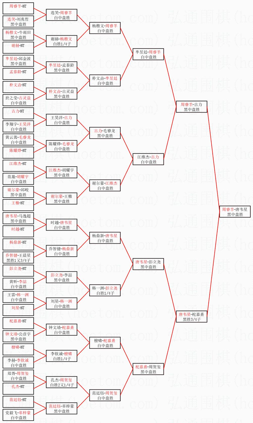 1.周睿羊获得冠军,唐韦星获得亚军。决赛比分:周睿羊1:0唐韦星。棋局: