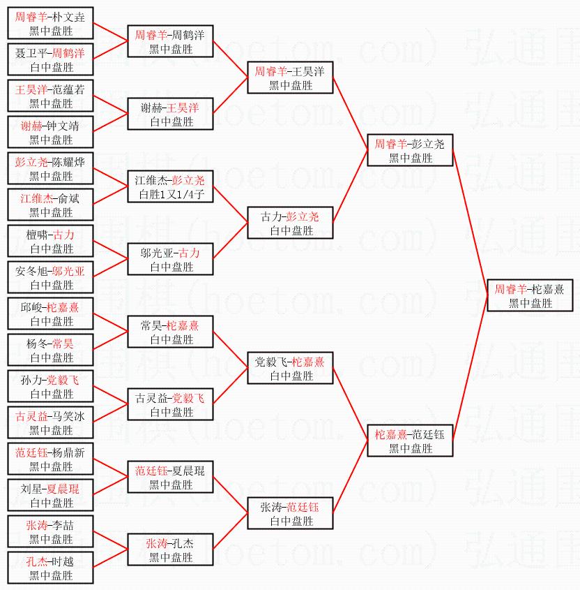 1.周睿羊获得冠军,柁嘉熹获得亚军。决赛比分:周睿羊3:2柁嘉熹。棋局:
