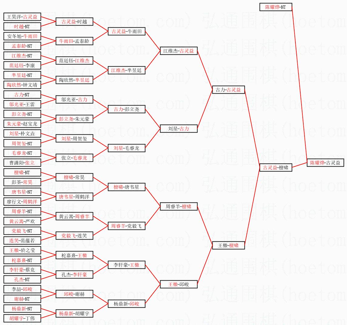1.陈耀烨获得冠军,古灵益获得亚军。决赛比分:陈耀烨2:0古灵益。棋局:
