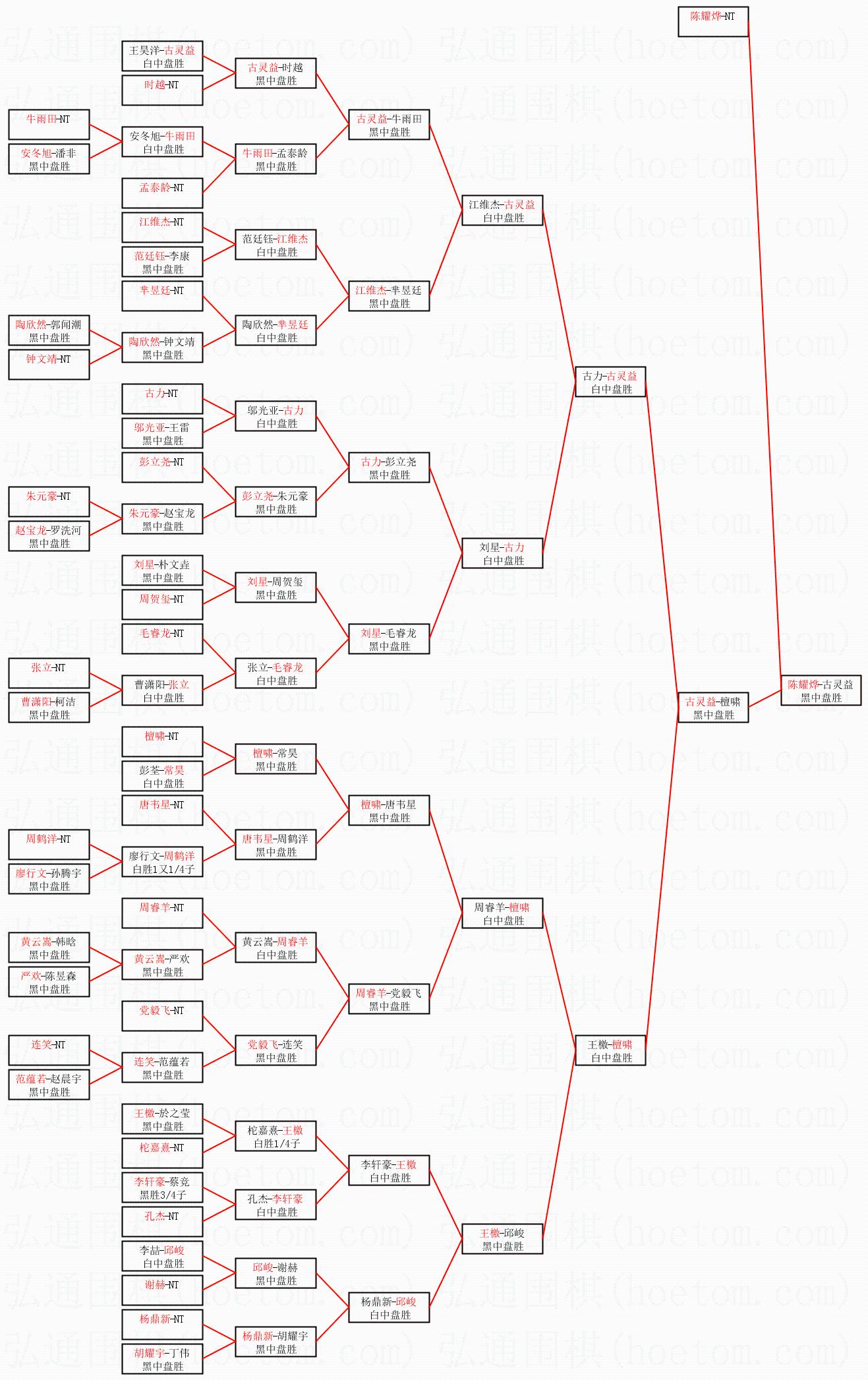 1.陈耀烨获得冠军,古灵益获得亚军。决赛比分:陈耀烨2:0古灵益。棋局: